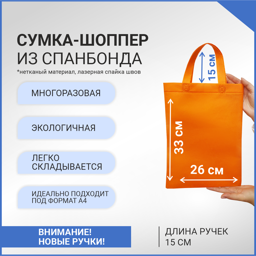 —Сумка-шоппер из спанбонда с пришивными ручками 15 см, оранжевая, 26 х 33 см