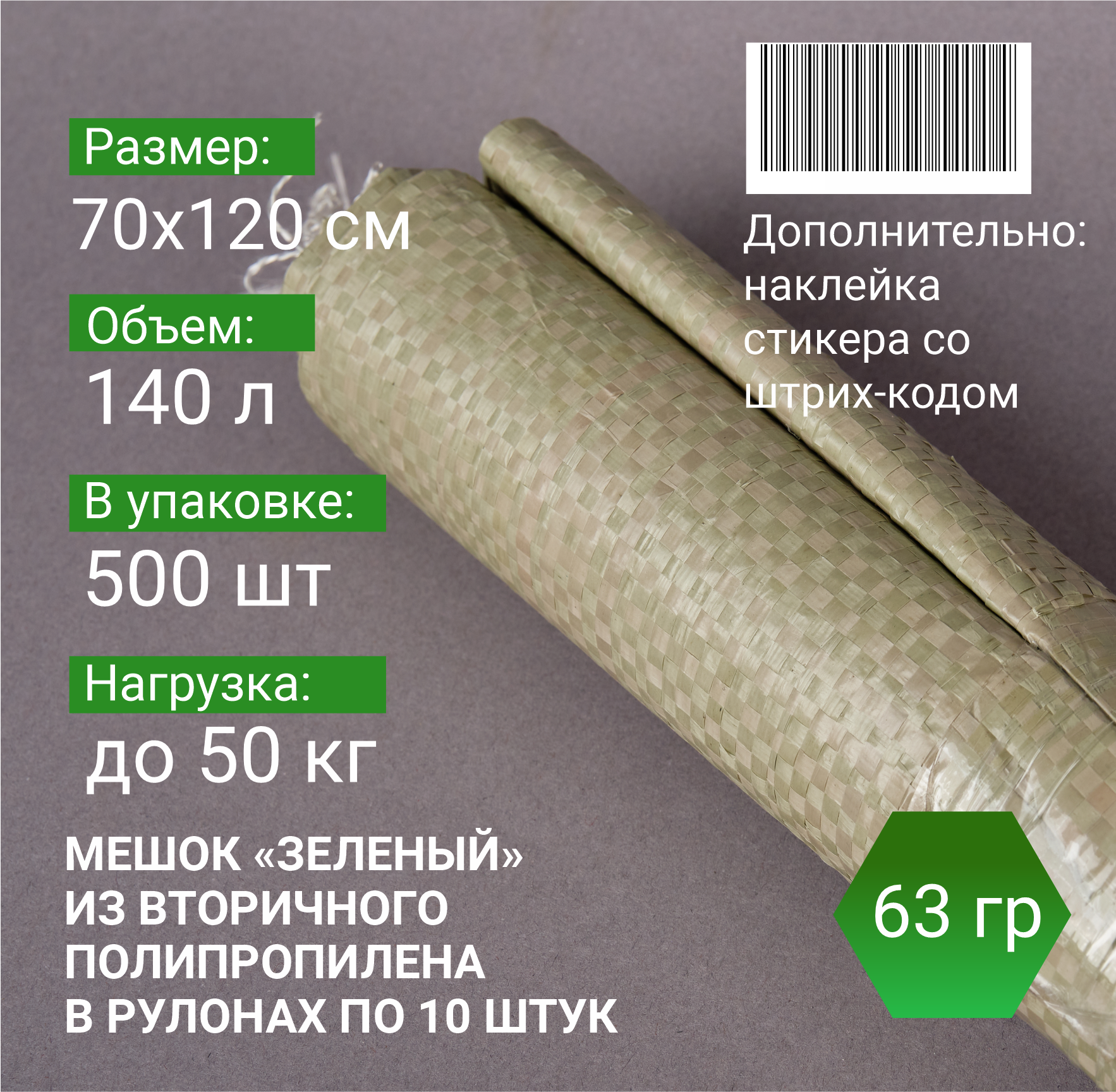 —Мешок п/п зеленый 50 кг, 70x120, 63 г, рулоны по 10 шт.